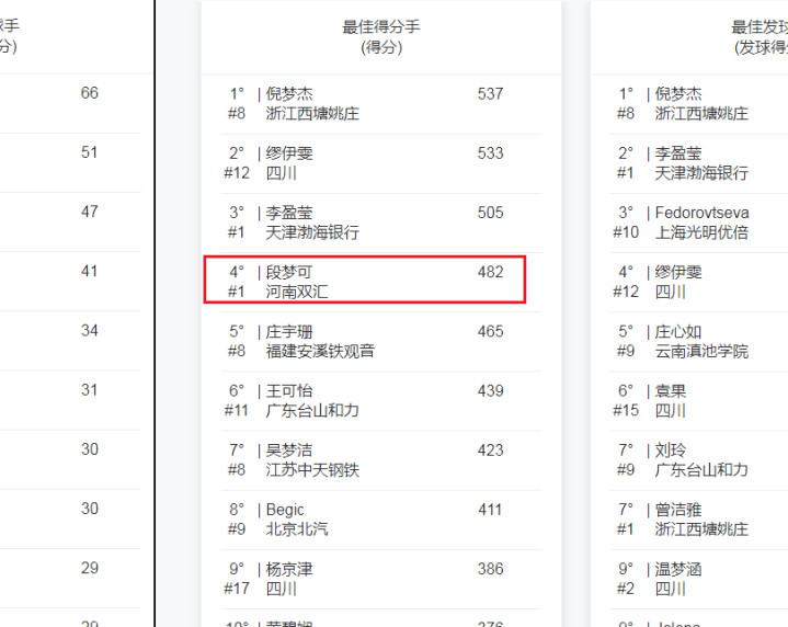身高1米98的段梦可是中国女排接应位置上的新秀,她的进步有目共睹。在决赛第三场,她49扣22中,发球得1分,总计贡献23分,与对手四川女排的队长缪伊雯并列全场最高。本赛季,段梦可在得分榜上以482分位居第四,成为联赛中一流得分手。
